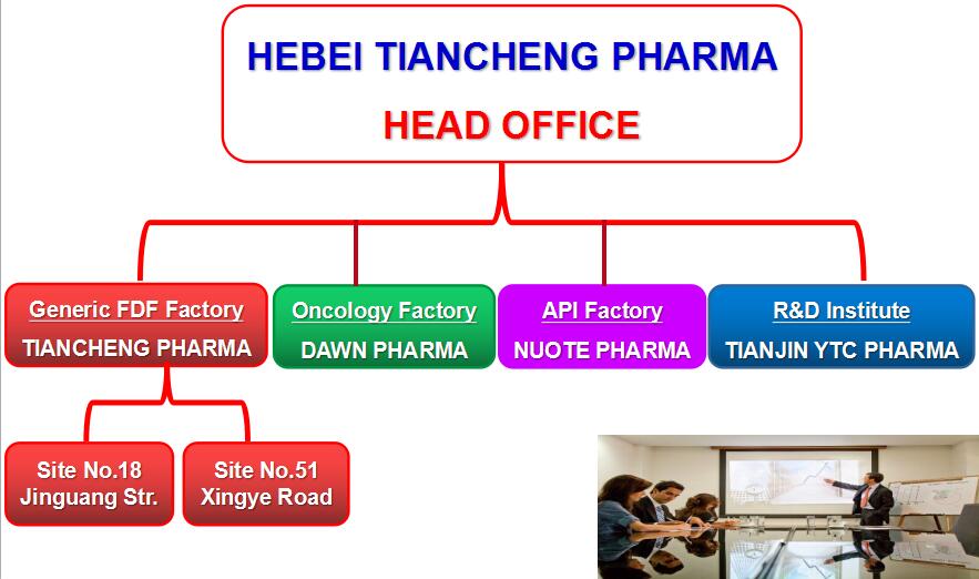 Now Hebei Tiancheng Pharma is a enterprises group containing Tiancheng Pharma (Generic drugs factory which has two sites at No.18 Jinguang Street and No.51 Xingye Road), Dawn Pharma (Oncology drugs factory), Nuote Pharma (API Factory), as well as Tianjin YTC Pharma (R&D Institute).