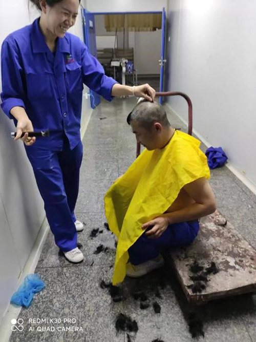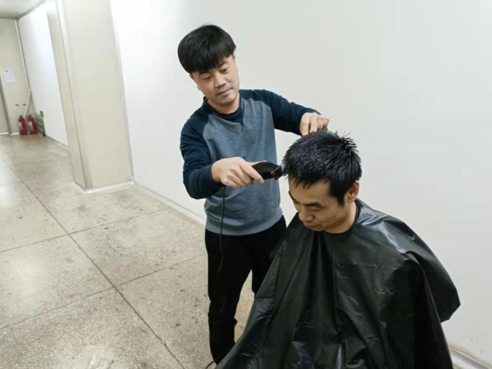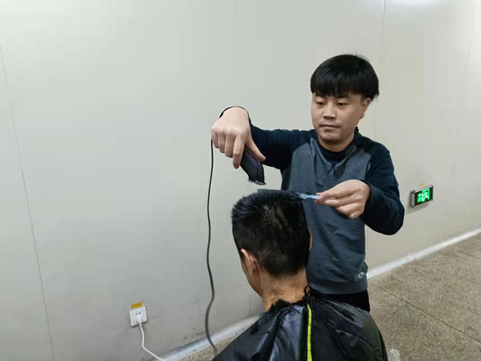 這一幕發(fā)生在11月21日公司中提車間。疫情阻擊戰(zhàn)開始至今已將近一月,為做好抗疫情保生產(chǎn)工作,公司采取了封閉式管理。500多名干部員工駐廠,堅(jiān)守崗位,加班加點(diǎn),維護(hù)了廠內(nèi)良好的生產(chǎn)生活秩序。然而,封控近一個(gè)月,越來越多的人有了理發(fā)需求。尤其是男職工,一個(gè)個(gè)發(fā)壓眉、鬢過耳,凌亂而萎靡的樣子,讓人看在眼里急在心里。