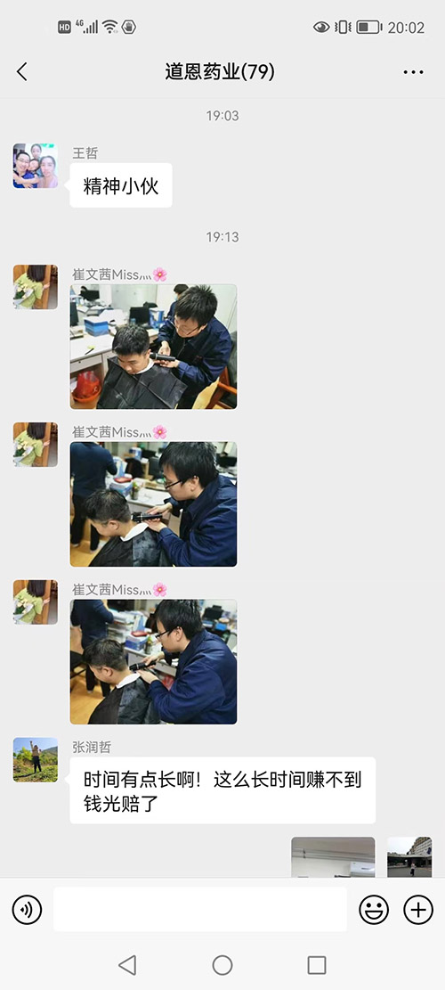 這兩天道恩藥業(yè)工作群里被一段段理發(fā)的視頻和搞笑的評(píng)論刷屏了。視頻里的“理發(fā)師”是道恩藥業(yè)生產(chǎn)總監(jiān)王學(xué)智,他拿著電動(dòng)推子全神貫注為員工理發(fā),每一下都十分認(rèn)真,不放過任何一個(gè)細(xì)節(jié);被理發(fā)的“頹廢少年”秒變“精神小伙”;圍觀群眾打趣到:“服務(wù)這么長(zhǎng)時(shí)間卻賺不到錢,光賠了。”理發(fā)現(xiàn)場(chǎng)的氣氛十分融洽,隔著屏幕都能讓我們感受到那份歡快。