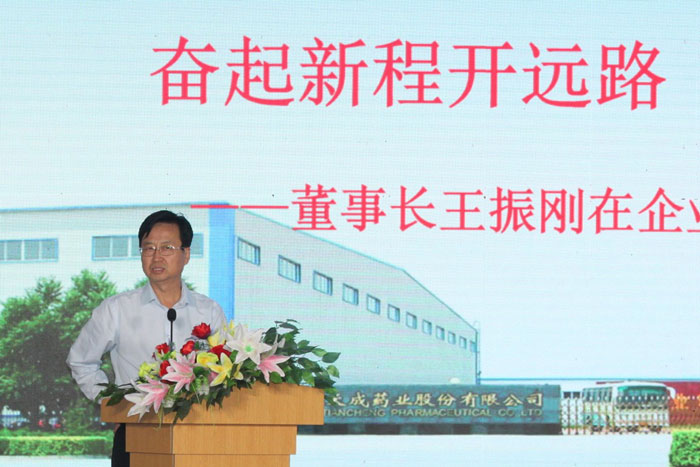 公司董事長王振剛、常務副總經理王顥,天成藥業總經理兼渤海分公司總經理孫元清,天成藥業常務副總經理王琦出席活動,天成藥業、道恩藥業科室后勤人員,全體中層及以上干部現場參會,渤海分公司、天津應天成科技有限公司不能到現場的干部員工通過視頻鏈接網上參會。